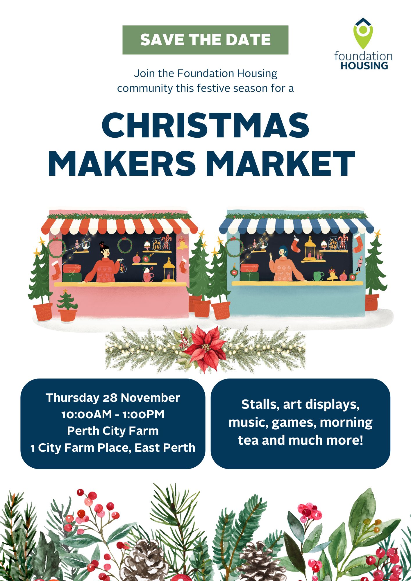 Want to receive vouchers to buy gifts for loved ones (limited supply) or for art/crafts for your own home? Join us for the annual holiday celebration Christmas Makers Market. Foundation Housing tenants will be selling their creations (most for $20 or less). But wait, there is so much more- a delicious morning tea will be provided, as well as entertainment, demonstrations and free prizes!