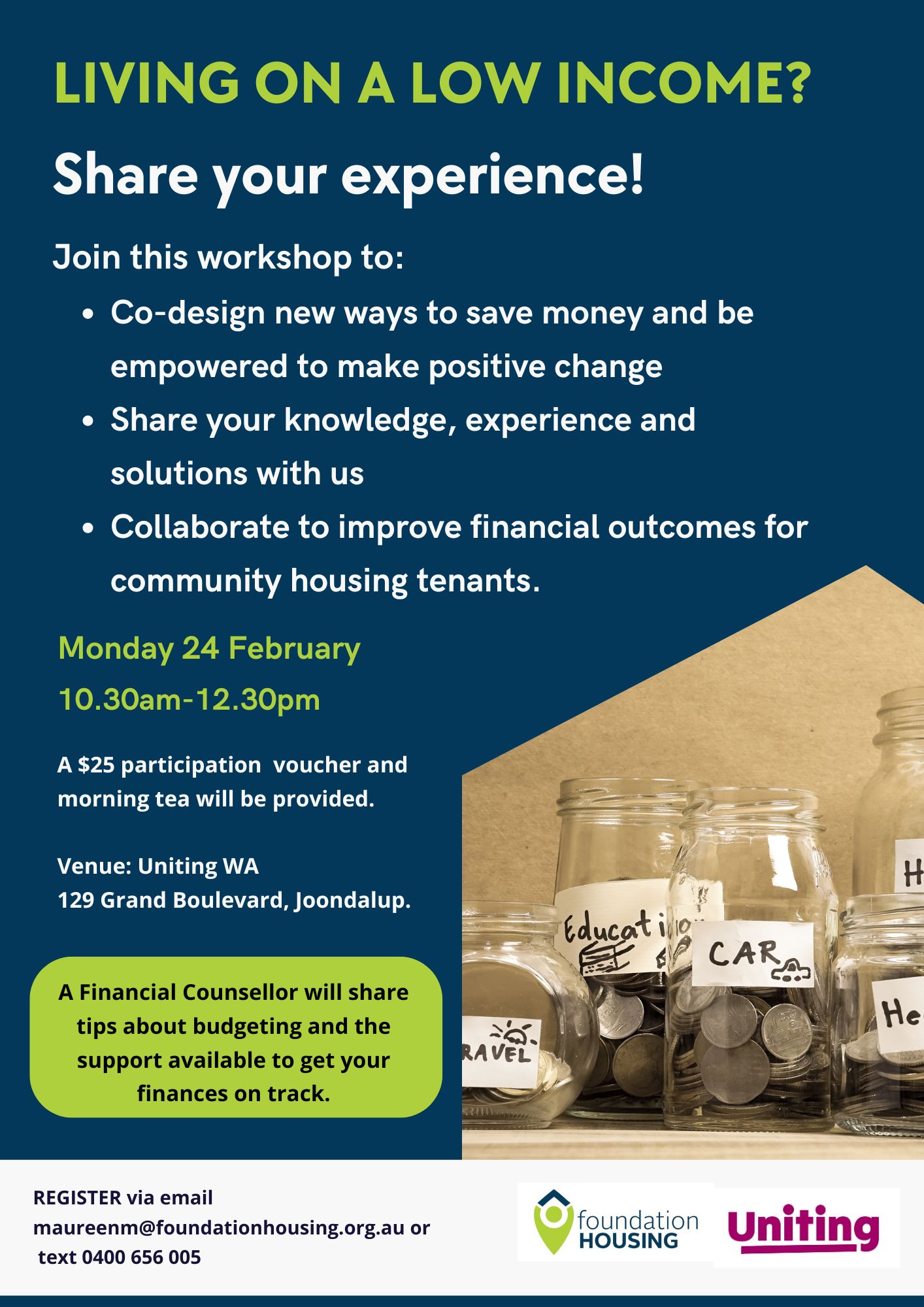 Get paid a $25 voucher to share your tips on living on a low income, while learning tips from other tenants. A financial counsellor will also share tips about budgeting and the support available to get your finances on track. Morning tea provided.