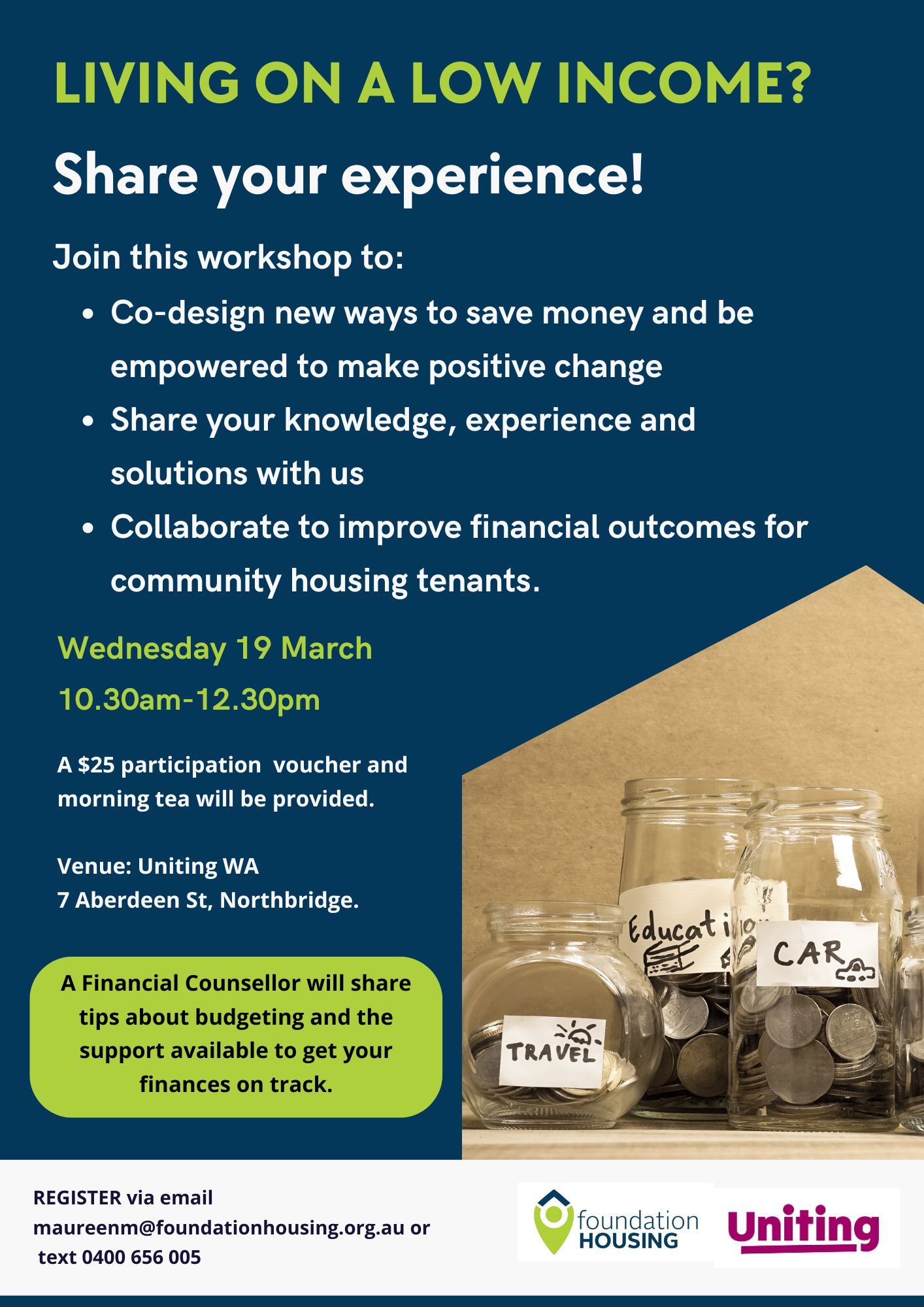 Get paid a $25 voucher to share your tips on living on a low income, while learning tips from other tenants. A financial counsellor will also share tips about budgeting and the support available to get your finances on track. Morning tea provided.